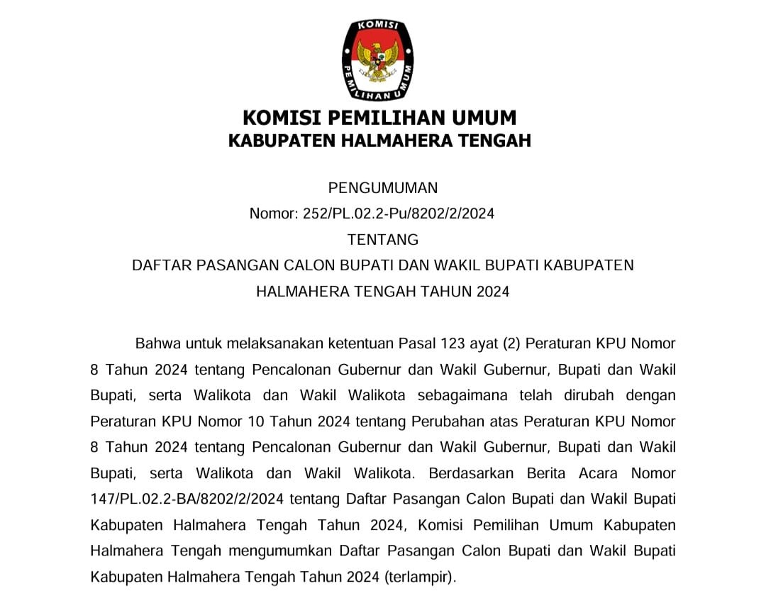 KPU HALTENG MENGUMUMKAN HASIL AUDIT LAPORAN DANA KAMPANYE PEMILIHAN BUPATI DAN WAKIL BUPATI KABUPATEN HALMAHERA TENGAH TAHUN 2024